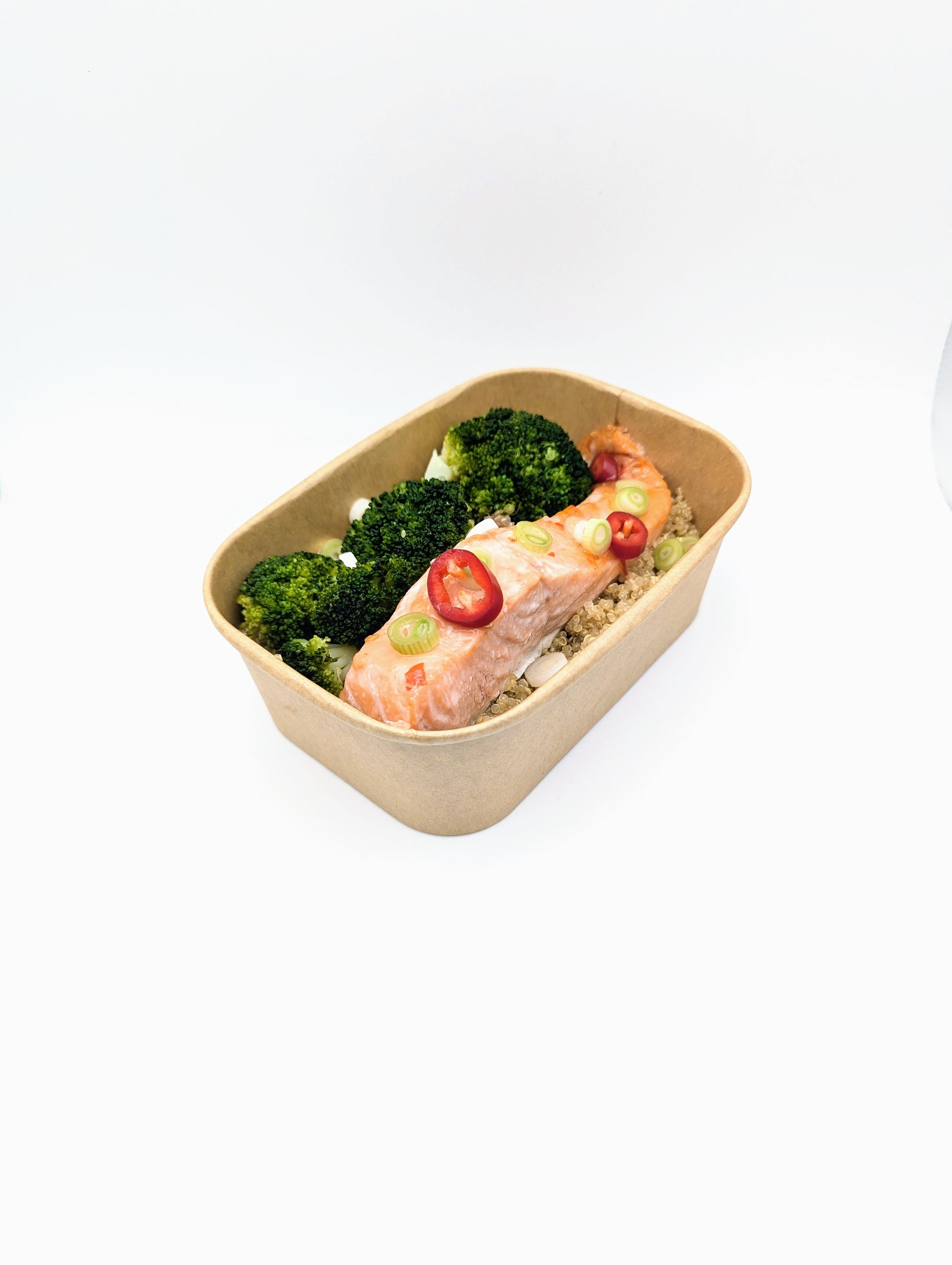 Sweet and spicy glazed salmon with fluffy quinoa and steamed broccoli